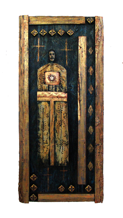 I began this piece with an unusually shaped scrap of iron I picked up in a salvage yard. I layered the metal with a thin silver piece of sheet metal, an oversized reproduction of an Indian Head penny, a cylindrical metal choker and another odd shaped piece of metal, a hoop of copper tubing and sheet metal copper cut in the shape of sun rays, two metal Turkish crosses, a bent fork, and copper flashing strips and nails. The beads are of stone, glass and ploymer clay, and the support for the piece is painted plywood.